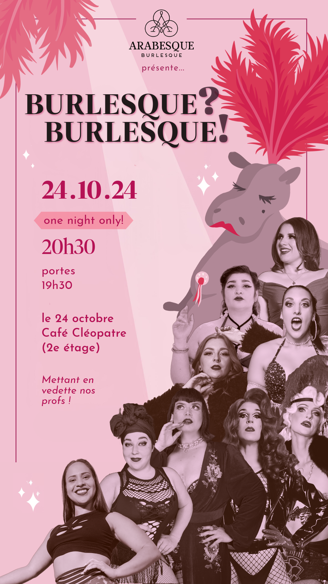 Entrez dans notre monde de glamour, d’esprit et de sensualité. « Burlesque ! Burlesque! » est une célébration extravagante du strip-tease théâtral et de l’art de la taquinerie, où chaque performance solo est réalisée par l’un de nos professeurs experts. Préparez-vous à des chorégraphies énergiques, amusantes et des costumes éblouissants. Chaque professeur a choisi son numéro préféré à vous offrir. un aperçu de ce qu’ils font de mieux ! Nous avons fait du thoron dans certains actes de groupe et dans certains clowns – parce que c’est exactement qui nous sommes 😉 » – Arabesque Burlesque