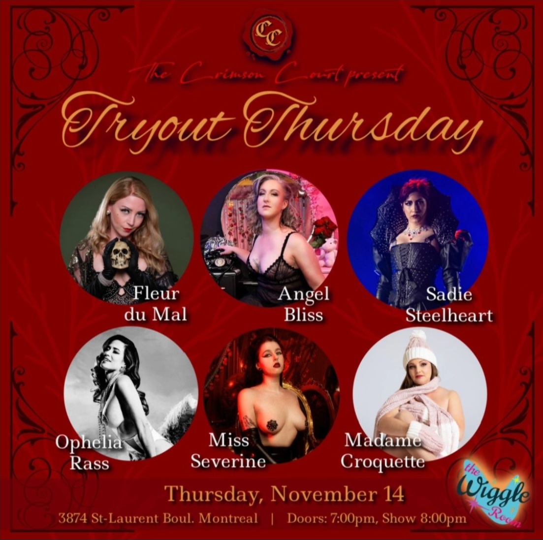 " Venez voir vos artistes préférés essayer du nouveau matériel et les nouveaux venus les plus chauds de la ville lors des TryOut Thursday ! Soyez le premier à être témoin de nouveaux numéros incroyables et des premiers pas de bébés burlesques avec une énergie comme personne d'autre !"
